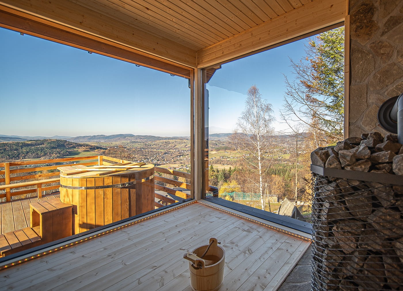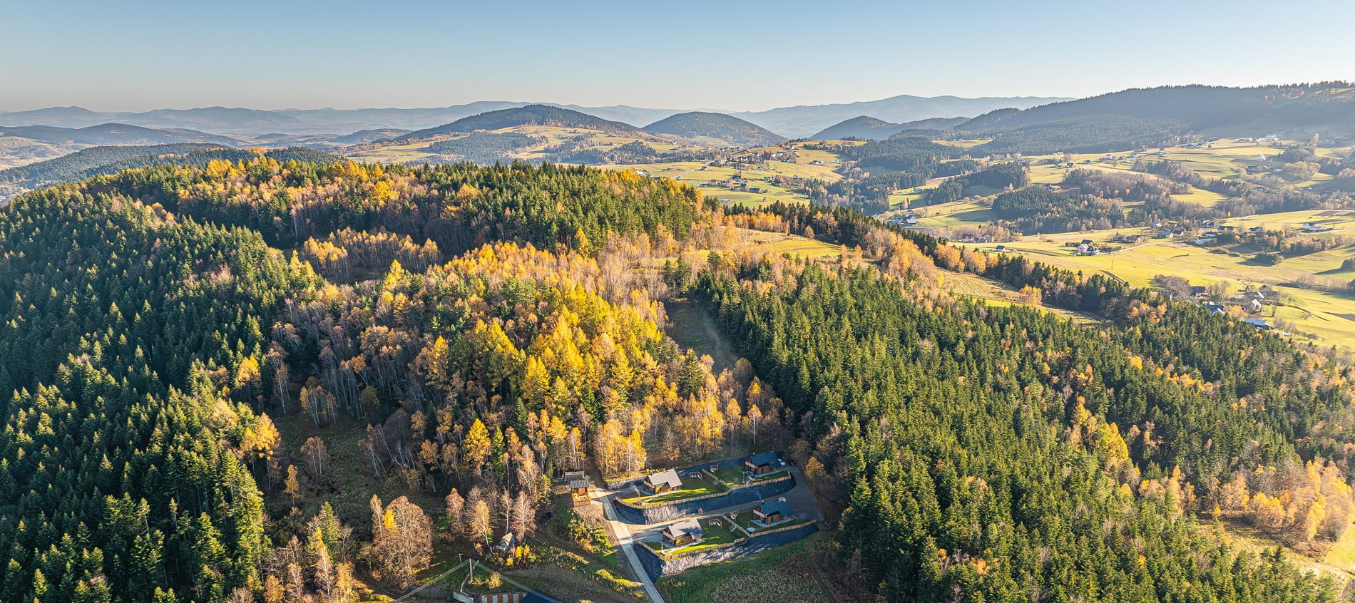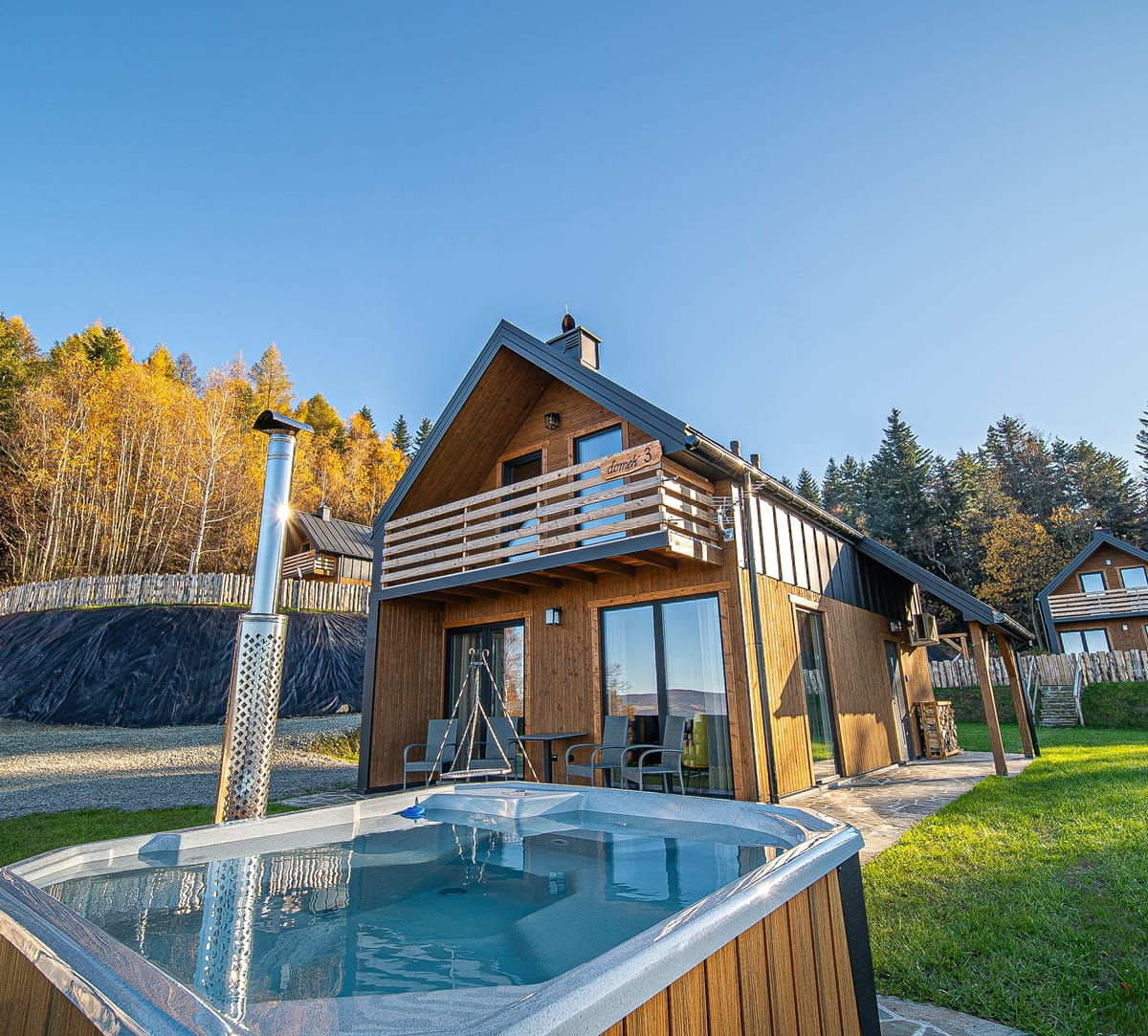 Całość prezentuje miejsce w malowniczym krajobrazie, podkreślając jego przytulny charakter i wyjątkowe widoki.